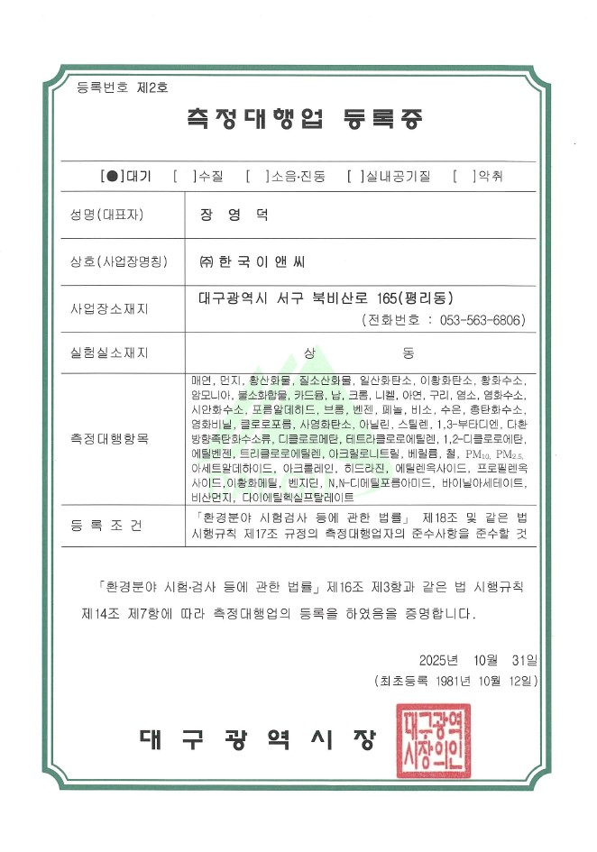 대기사업그룹에서 "다이에틸헥실프탈레이트"를 측정 항목으로 추가하여, 전항목 측정이 가능함을 알려드립니다. (주)한국이앤씨 대기, 수질 분야는 전항목에 대한 측정과 분석이 가능합니다. 감사합니다.